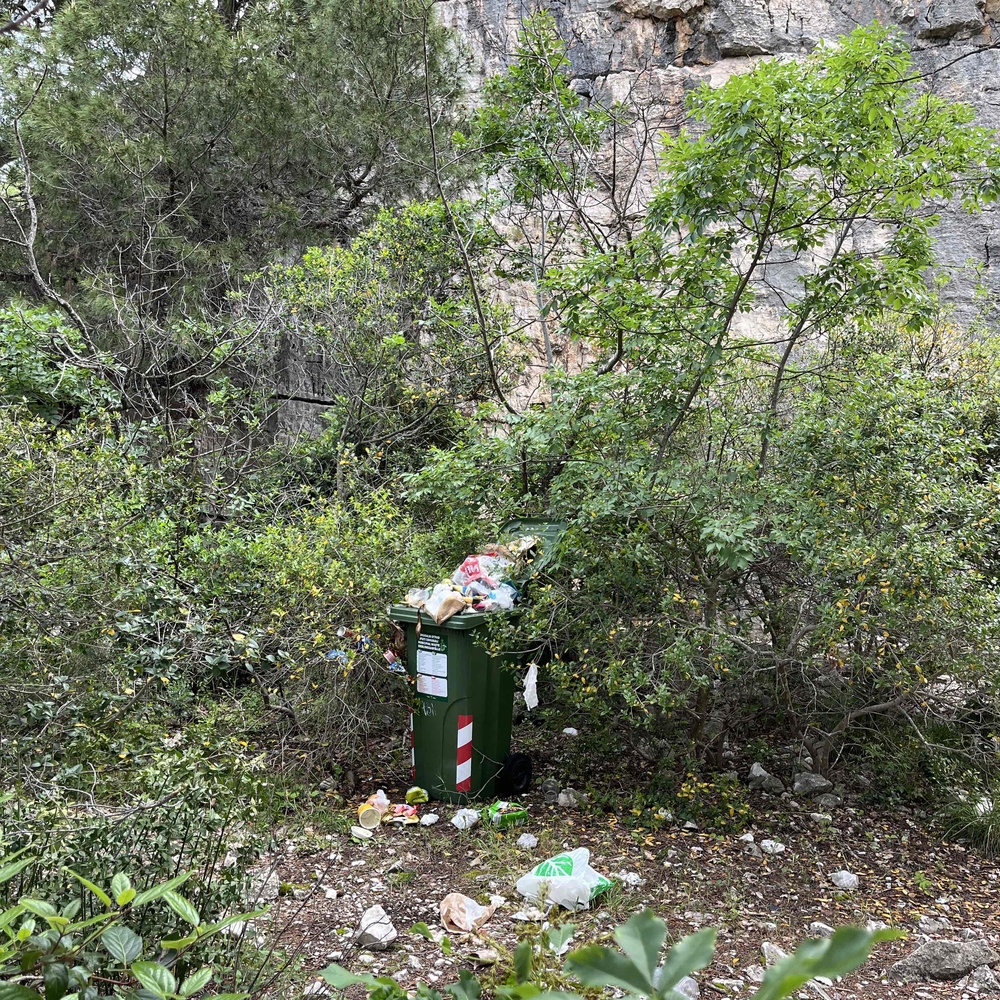 Donji dio kamenoloma ima kantu prepunu smeća.